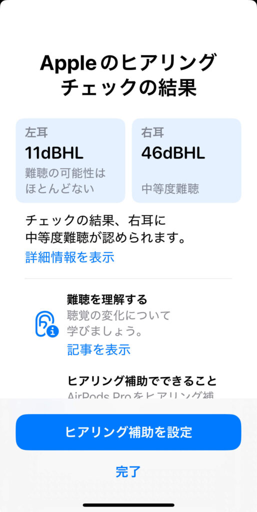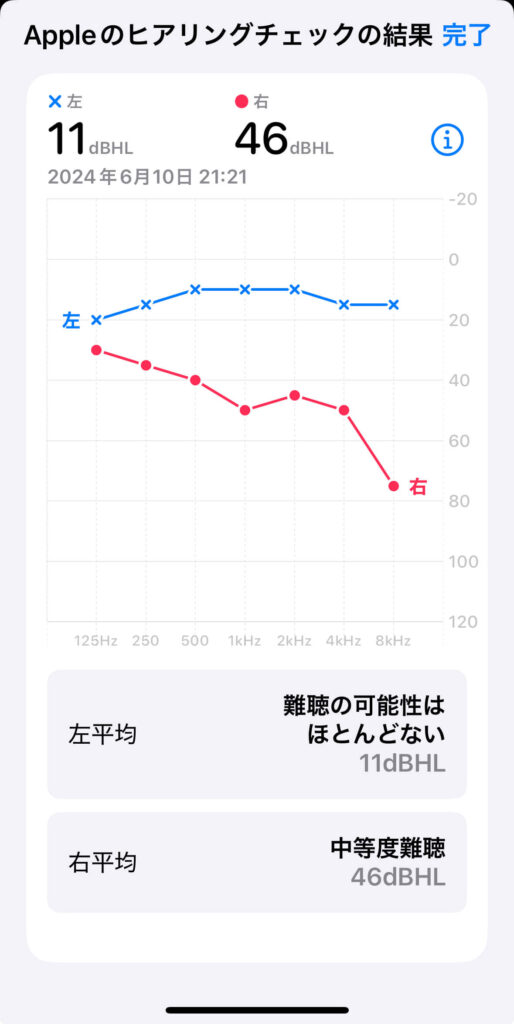 残念ながらiPhoneの検査結果では高度難聴との判定。そうなると機能しないらしいので、病院で検査を受けたデータ(オージオグラム)を取り込むことにしました。