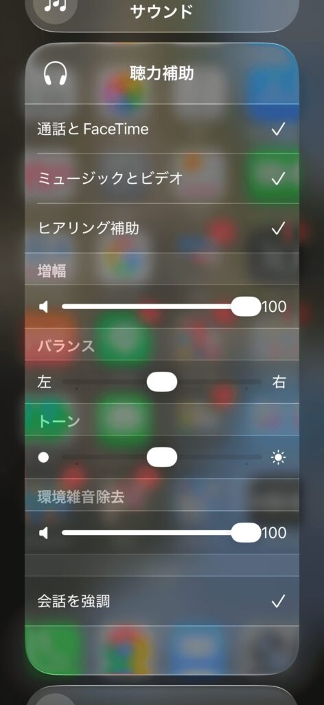 私は聴力補助の機能で「増幅」と「環境雑音除去」を100にし、「会話を強調」を「✔」にして使用しています。