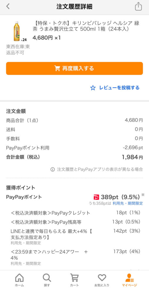 ヘルシアは定価に近い価格で販売されていることが多く、クーポンもほぼ無いのですが、PayPayポイントを使うことで実質的な値引きを得ることができました。